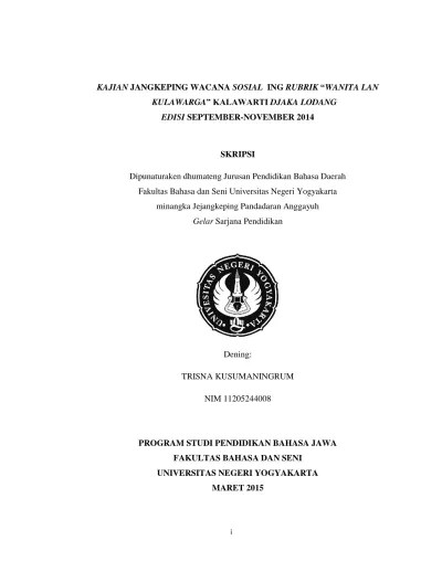Cacahing wanda/suku kata saben sagatra. Ciri basane teks wayang (teks narasi) 4 jam pelajaran ===== i. Mirengaken ceramah babagan budaya jawa mata pelajaran : Upacara ruwat pembersihan segala dosa yang pernah dilakukan mulai kanak kanak sampai dewasa. Yaiku tembung garba sing ora kalebu ing lelorone iku. Kang na dharat datan bisa uning, ing jagating kono, ya wis dadi kaya merad bae, sabab uwise ora balik maning, lan ora kapanggih, lan ora na kang weruh. tembung kriya, tembung aran, tembung kahanan, tembung sesulih, tembung wilangan, tembung katrangan, tembung panyeru, tembung panggandheng, tembung panyambung 4. Ana ing bahasan ini bentuk sing disinaoni cara morfologis sawenehing tembung sing awujud polimorfemis. Academia.edu is a platform for academics to share research papers. Goleka tuladhane tembung garba 5 bae! Yaiku tembung garba sing oleh aksara y (ya). Wujuding kaimat/bentuk dibedaake dadi 5 (limang) perkara yaitu: